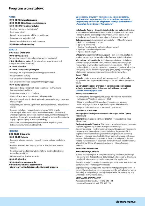 W otoczeniu przyrody, nad jeziorem, z dala od zgiełku codzienności, zapraszamy Cię na wyjątkowy warsztat inspirowany autorskim projektem rozwoju świadomości „Poznając Siebie Żyjemy Prawdziwie”